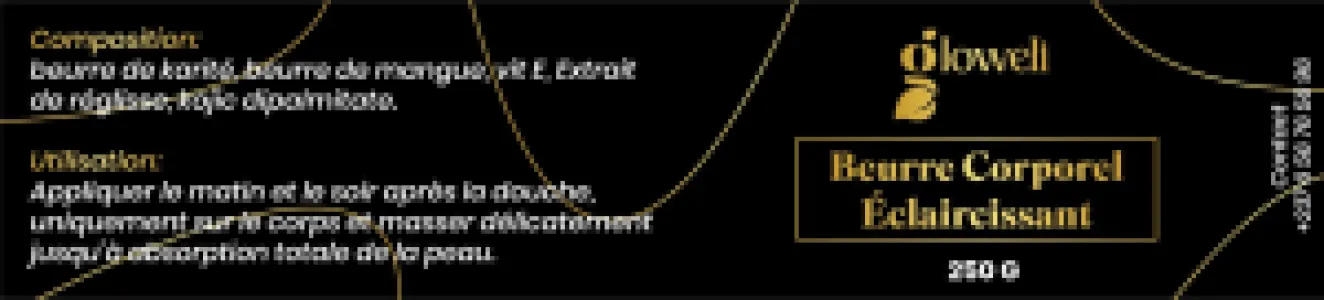 Il est fait à base de beurre de karité, beurre de mangue, Vit E, extrait de réglisse, kojic dipalmitate. Ce beurre est à utiliser matin et soir après sa douche lorsque la peau est encore humide après avoir utilisé le savon noir et le gel de nila.